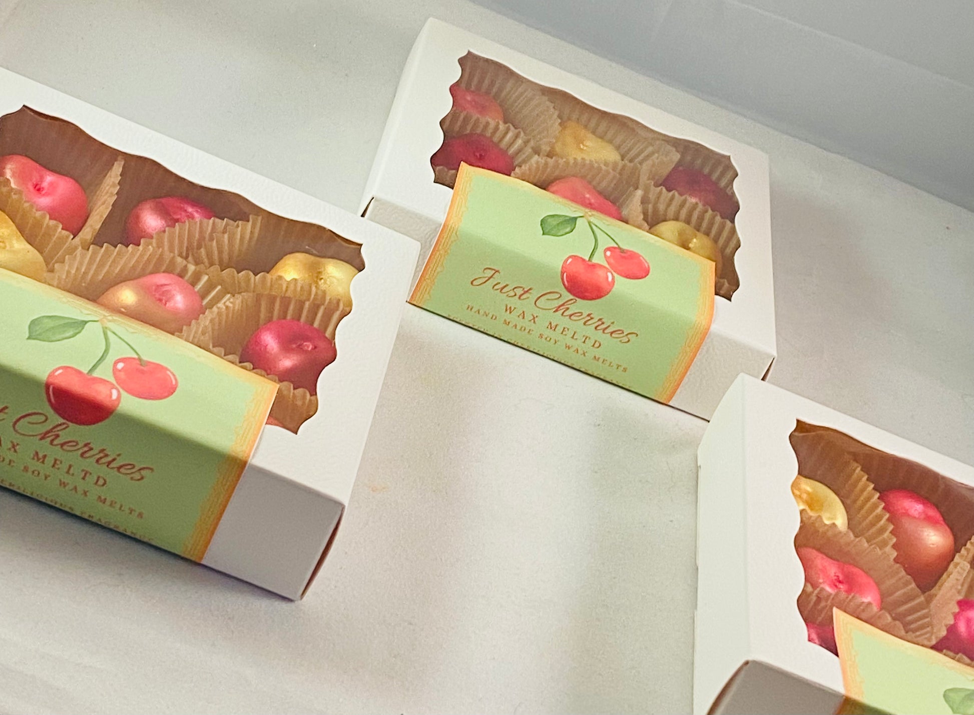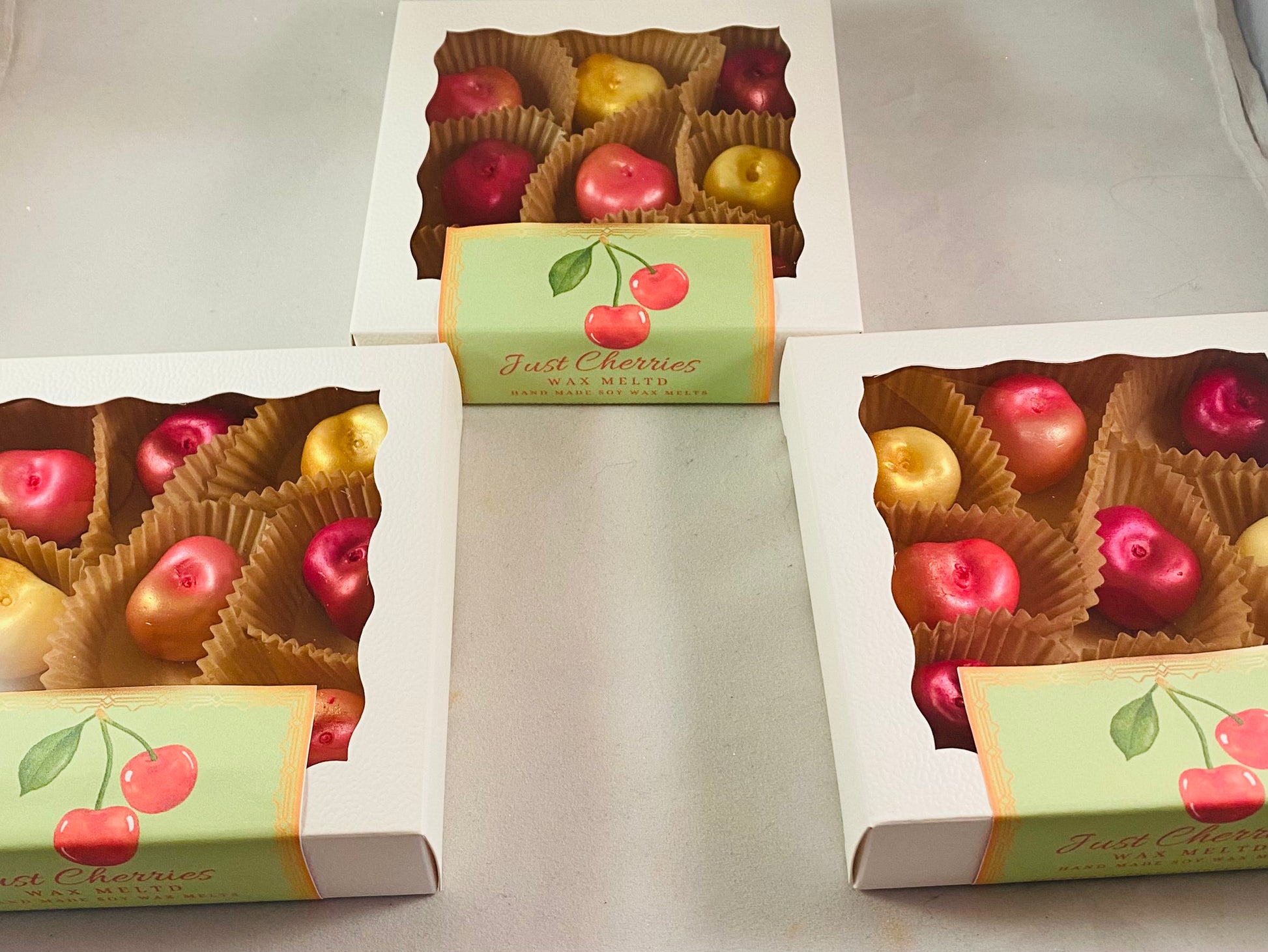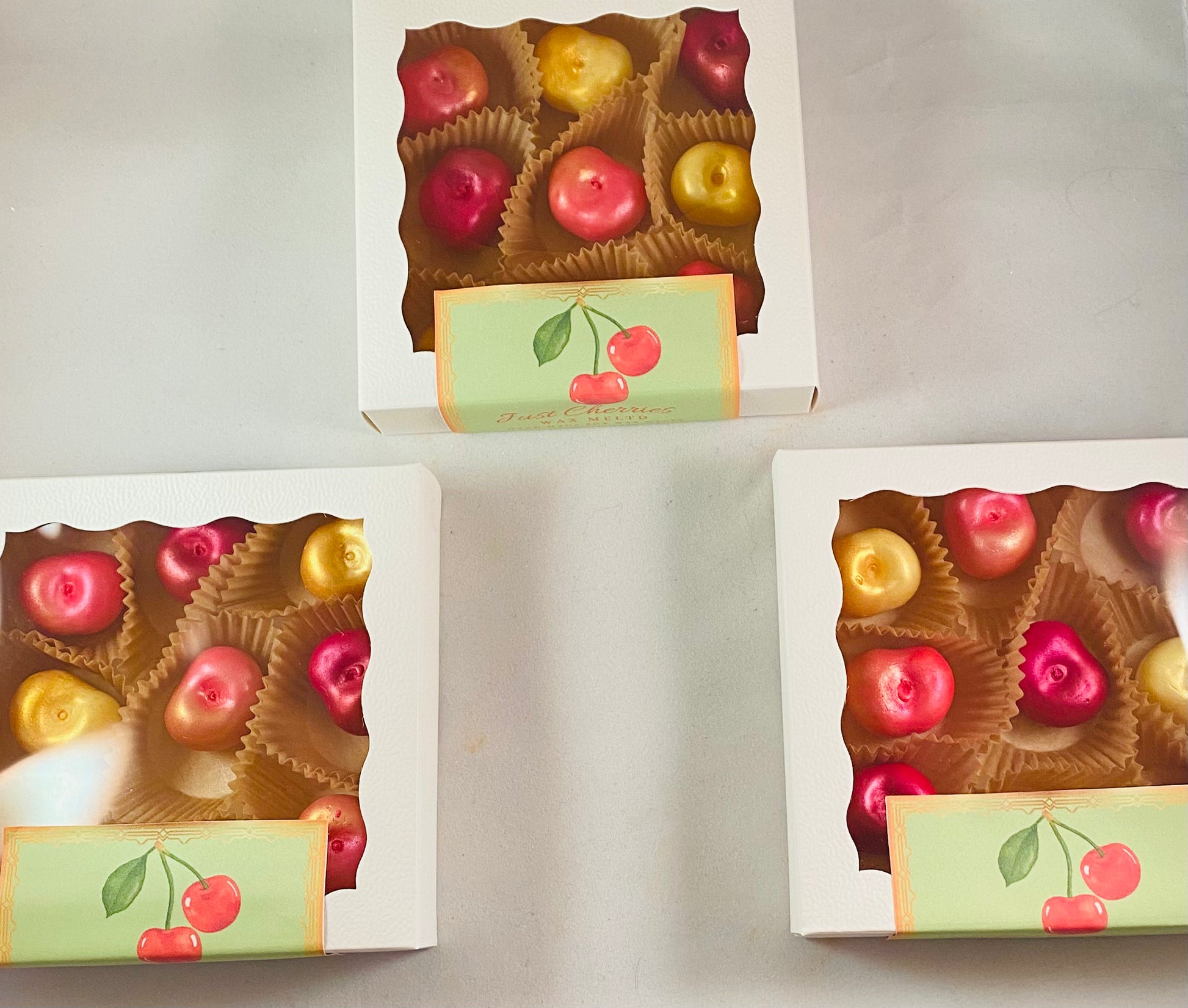 2.5oz Wax Melt 9 cherries- 3 yellow/gold color, 3 red color, 3 pink/gold color.