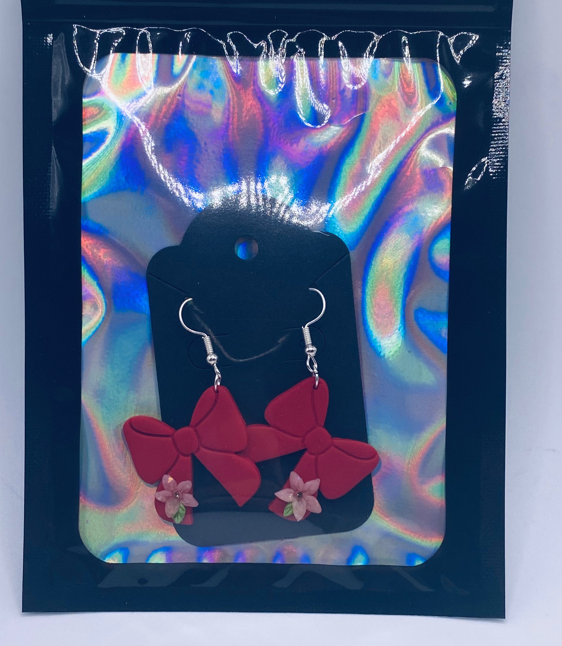 Red Bow with Pink Flower Elegant Polymer Clay Earrings